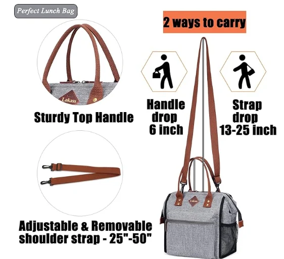 Gréisste Mëttegiessen Bag huet e Haaptraum (10.5 "X6" X12 "), eng grouss Front Zipper Tasch (8" X7 "x1.5"), eng Réck Makéit (9.5 ") an 2 Säit Mespazen. Tophandle an Upassbar & eraushuelbar Schëllerbréif (25 "-50") Design fir einfach droen.