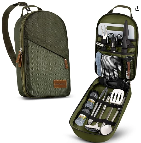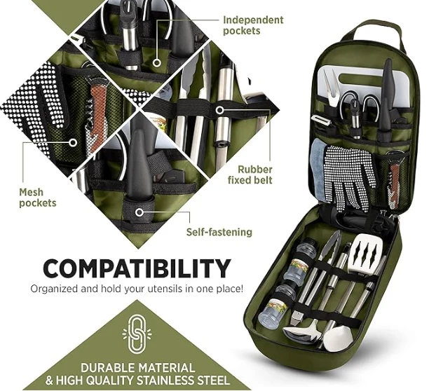 Portable Outdoor Camping Tool Technik, all Utensil huet säin eegene designéierte Such, sou Eenheeten, schloen oder am Lagerung. Bitt einfach Zougang zu Ärem Kachen Utensils an et ass mat engem séchere Zipppersiicht ausgestatt